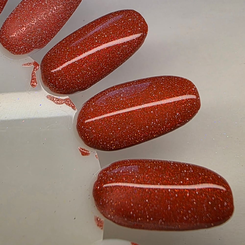 Proto 23 is a medium pumpkin orange with both gold and silver reflective glitter along with some red/orange aurora shimmer.