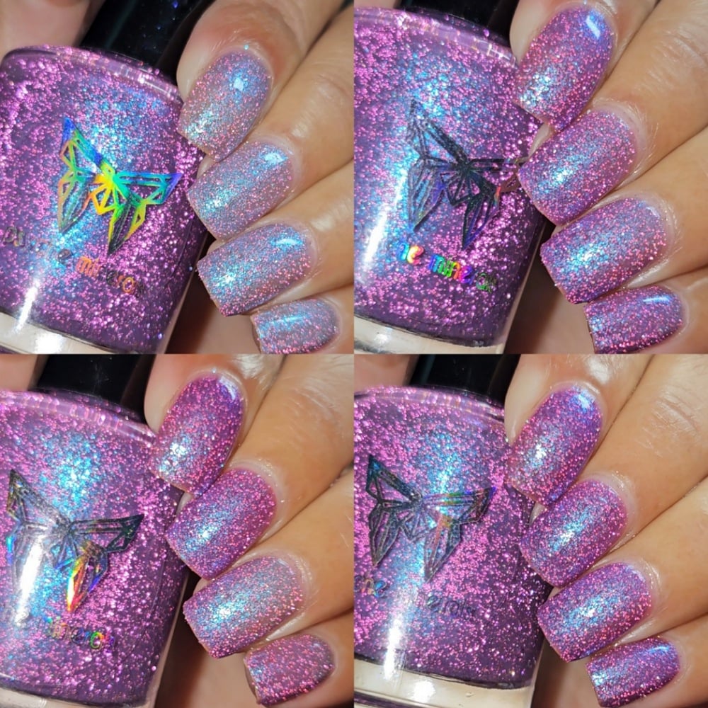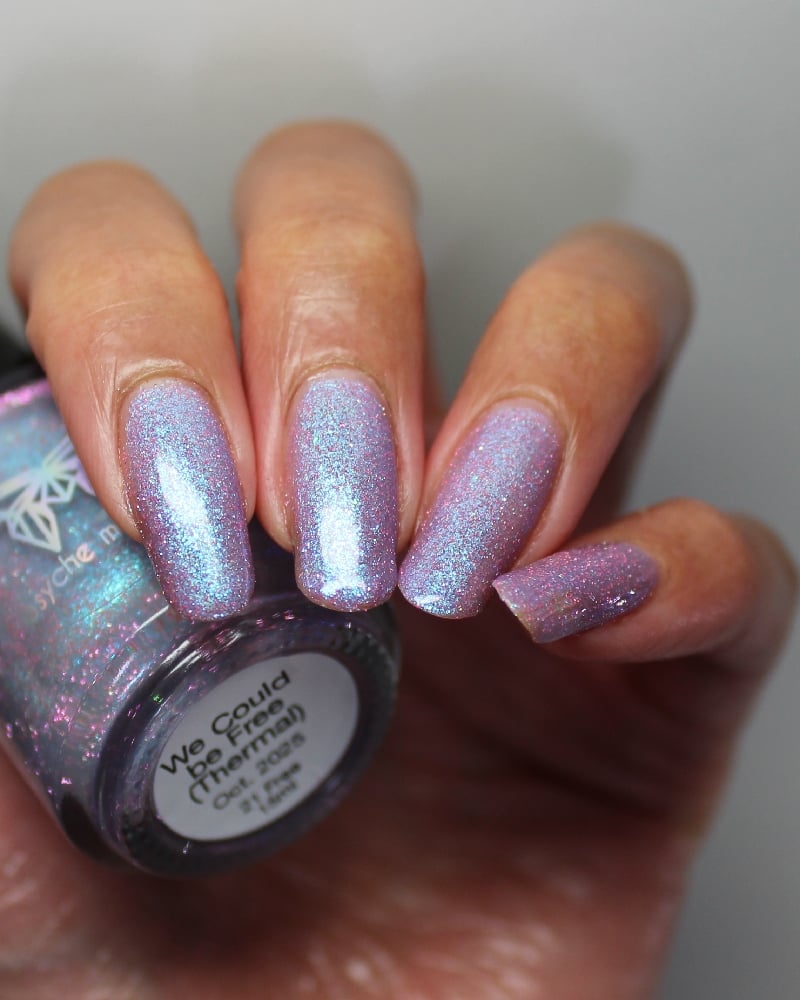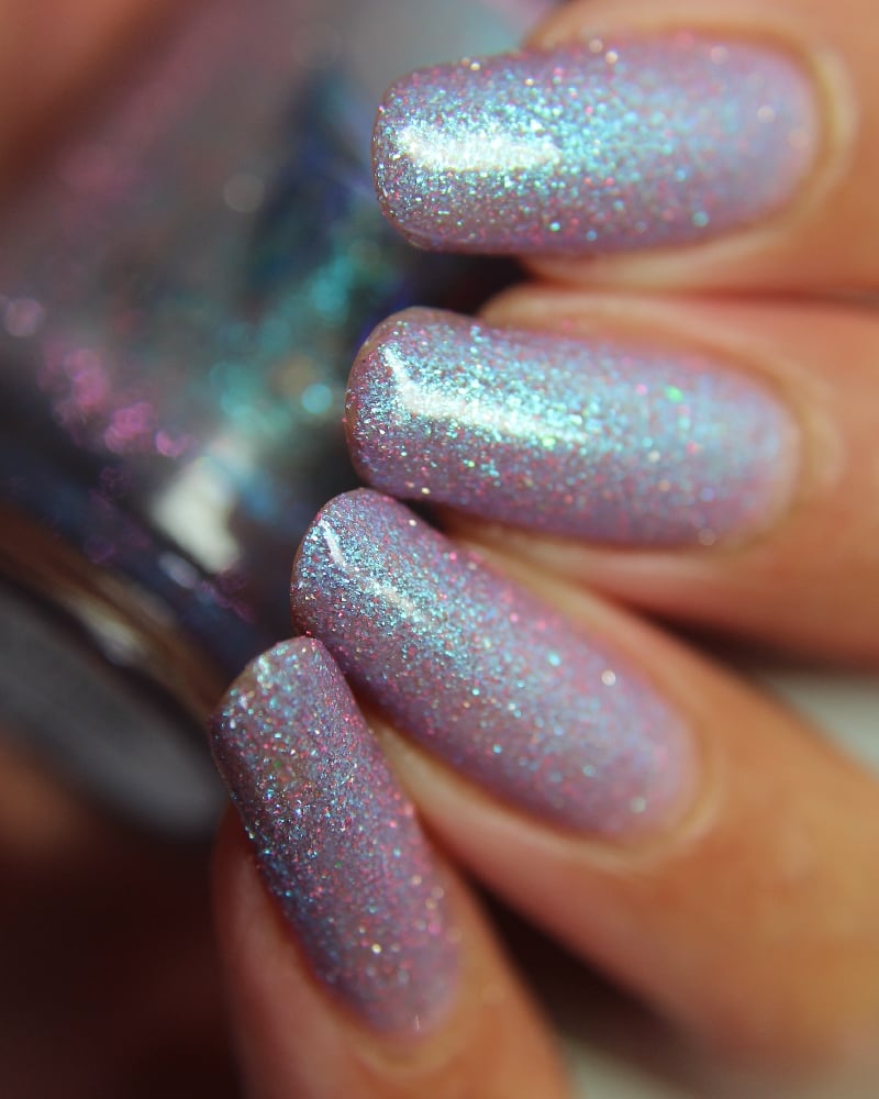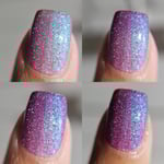 What it Sounds Like (thermal) - a lighter purple(cold) to light blue (warm) thermal with aqua to blue large particle aurora shimmer and a smattering of pink reflective glitter.